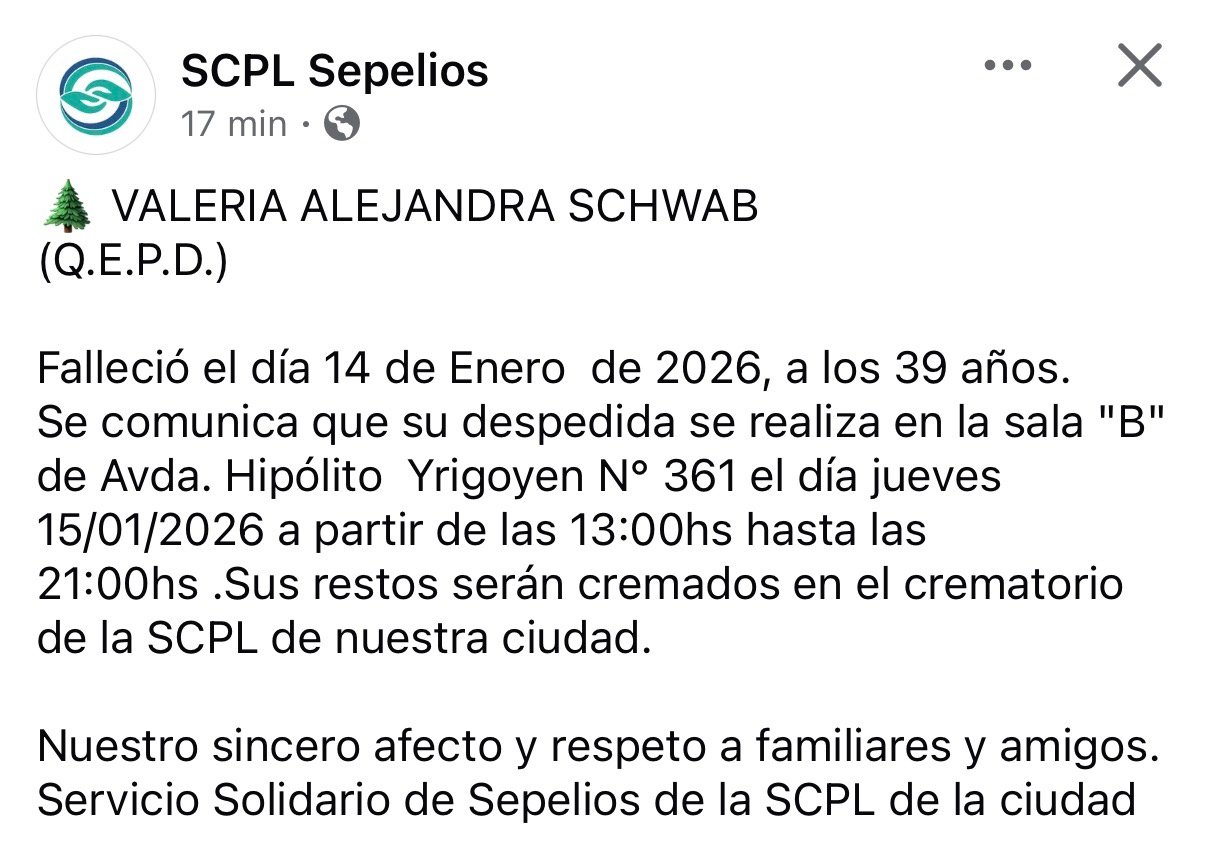 Los restos de Valeria serán cremados en el crematorio de la SCPL de la ciudad. El Servicio Solidario de Sepelios de la SCPL expresa su sincero afecto y respeto a familiares y amigos en este momento de dolor.