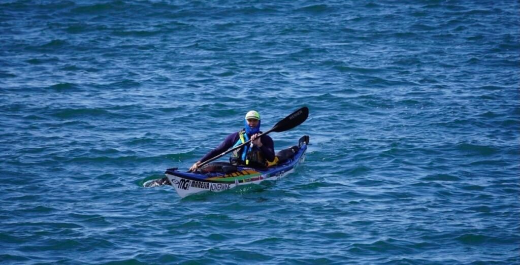 Con paciencia y determinación, el kayakista continúa su travesía: “Hay mucha agua por delante, y hay que hacerlo despacio y con calma”.