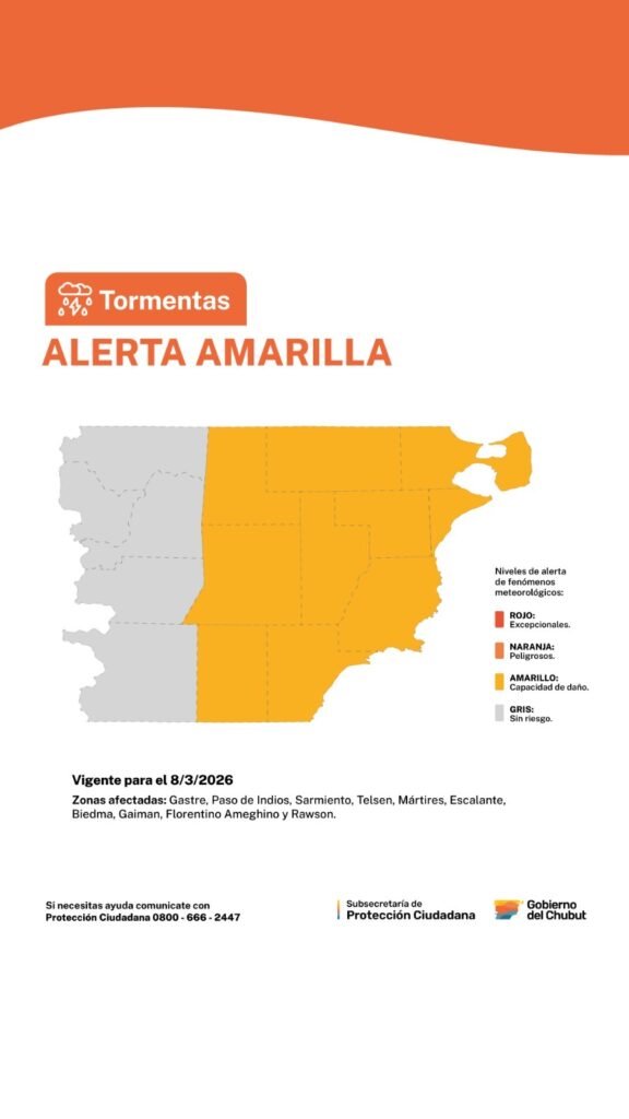 El aviso rige desde el mediodía hasta la noche del 8 de marzo. Se esperan tormentas de variada intensidad con abundante caída de agua en cortos períodos y fuerte actividad eléctrica.