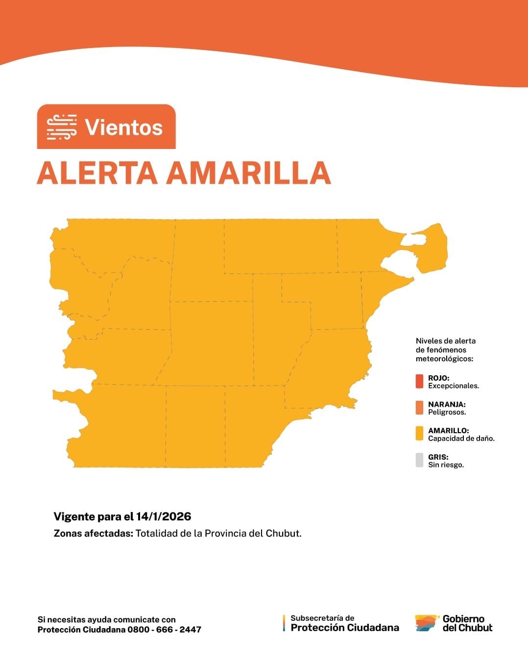 La alerta amarilla por vientos regirá para la tarde del miércoles 14 de enero, mientras que la alerta amarilla por lluvias se prevé para la noche del mismo día. Ambas alertas cubren la totalidad de la provincia del Chubut.