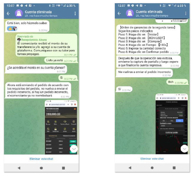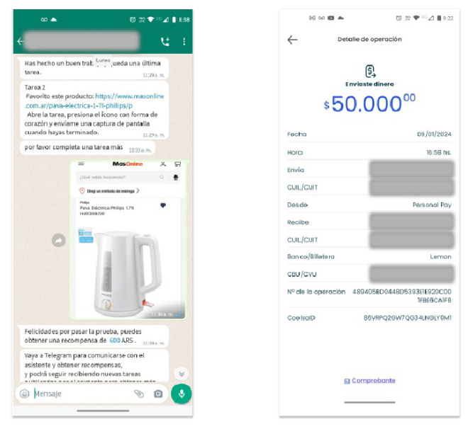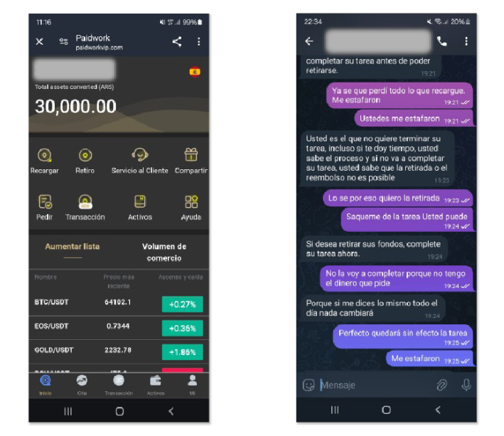 Luego, tras brindar algunas compensaciones por ello, las plataformas incentivan a las personas a realizar otro tipo de tareas llamadas “prepagas”, por lo que se las induce a crear una cuenta en su plataforma y a comenzar a invertir en la compra y venta de criptoactivos “con la promesa de brindar ganancias extraordinarias de entre el 30 y el 60 por ciento del monto invertido”.