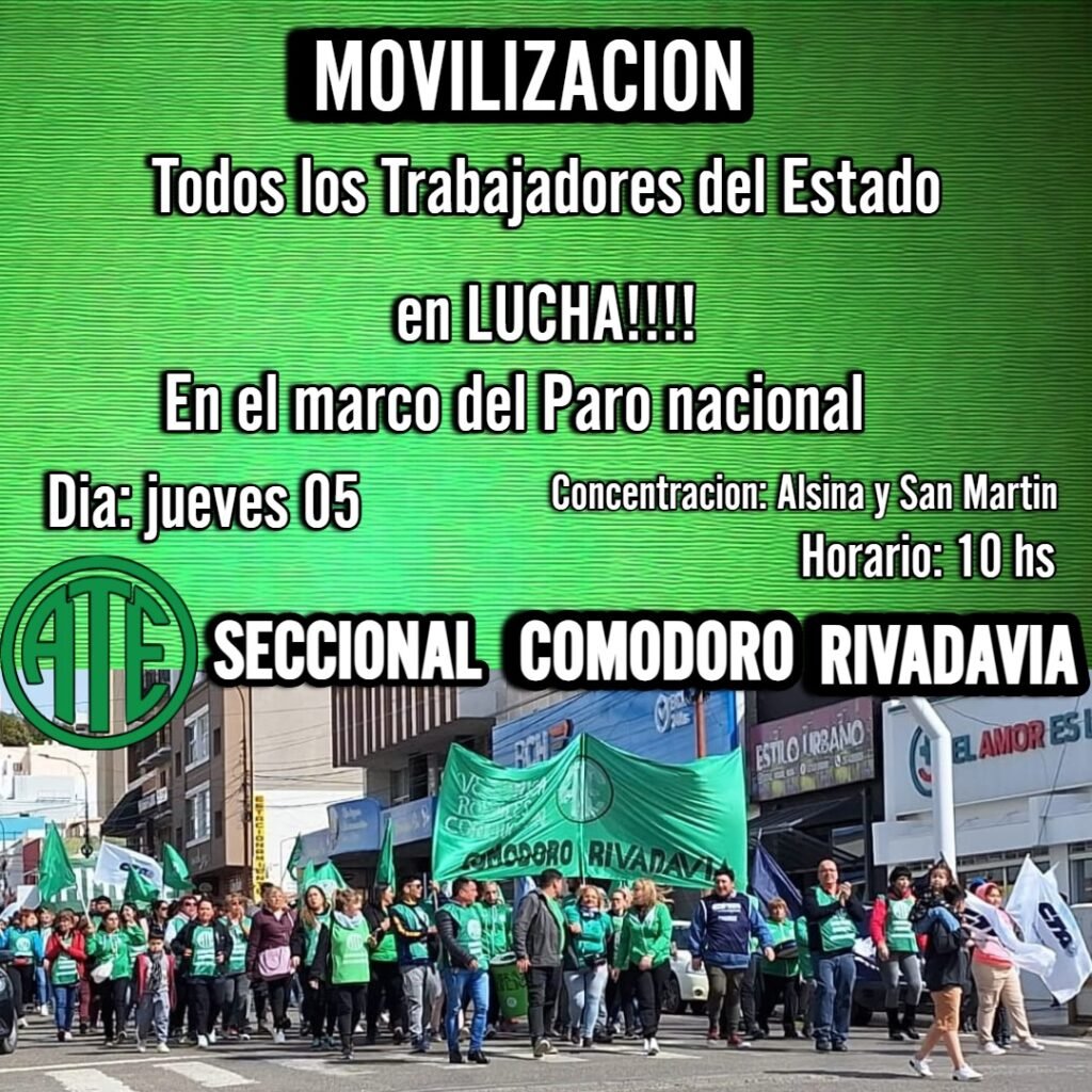 Este jueves 5 de diciembre desde ATE Seccional Comodoro Rivadavia invitan a los trabajadores del Estado a ser parte de la movilización y jornada de lucha nacional.
