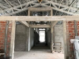 La obra ya cuenta con el hall de ingreso techado, aberturas de aluminio y vidrios DVH ya instalados; el sector de aulas, también techado y con el proceso de instalación de aberturas en curso; fundaciones en proceso en el sector del núcleo sanitario y SUM (Salón de Usos Múltiples); el edificio adyacente que albergará el comedor, actualmente en un estado de finalización del 95%, tanto con pisos, aberturas como revestimientos instalados. Y, finalmente, el sector de los talleres en tareas de fundación.