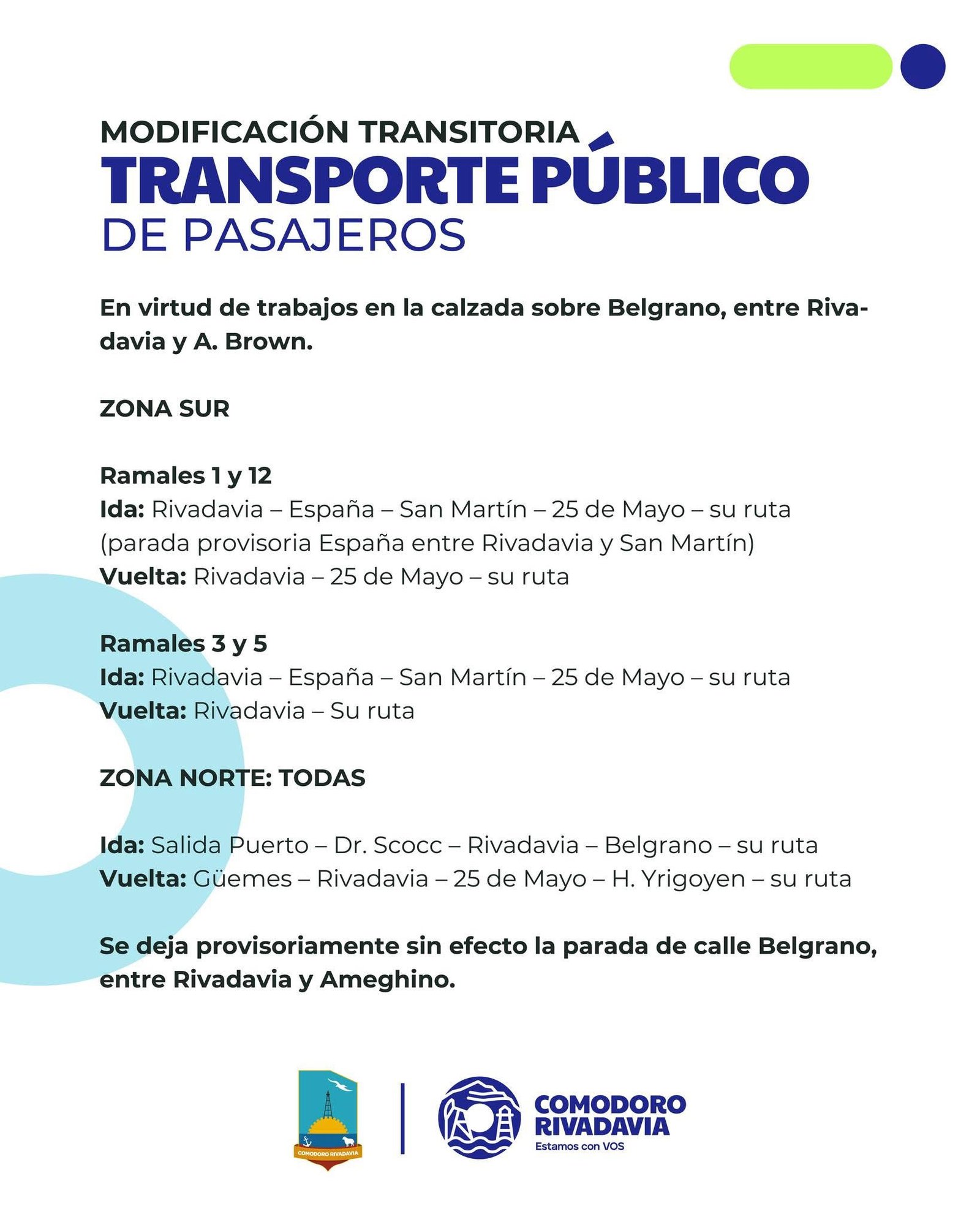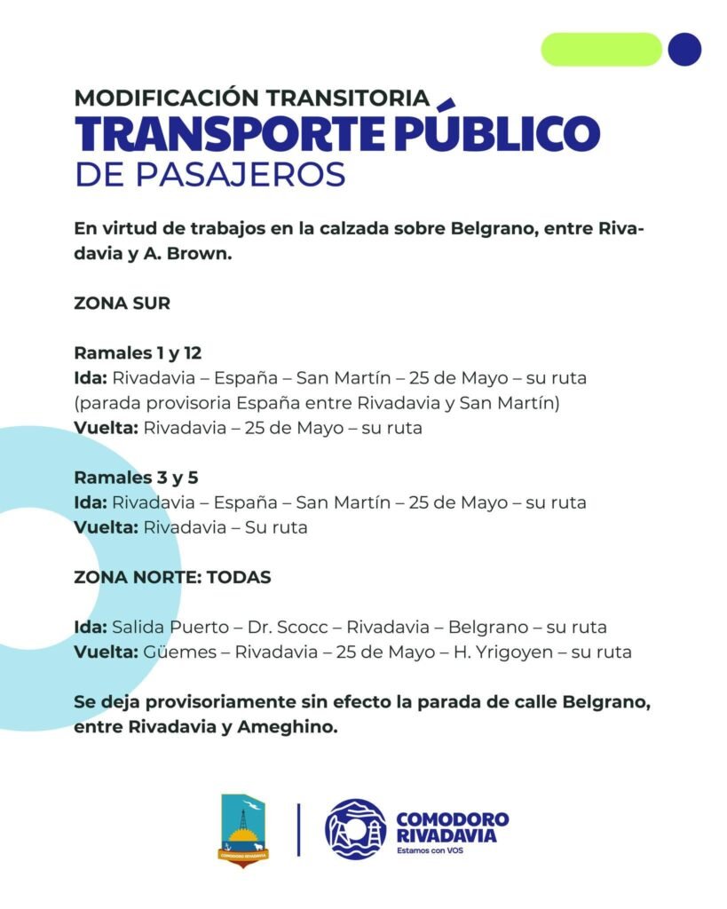 La Municipalidad de Comodoro informó que hay una modificación transitoria en el transporte público de pasajeros en Comodoro Rivadavia debido a trabajos en la calzada sobre la calle Belgrano, entre Rivadavia y A. Brown.
