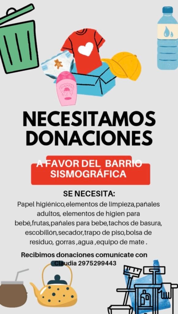 Vecinos están realizando una campaña de donaciones para recolectar elementos esenciales para sus habitantes. Se necesitan diversos artículos de primera necesidad, entre ellos: papel higiénico, elementos de limpieza, pañales para adultos y bebés, frutas, pañales para bebé, tachos de basura, escobillón, secador, trapo de piso, bolsa de residuo, gorras, agua y equipo de mate.