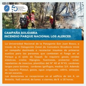 El fuego sigue extendiéndose y la solidaridad de los comodorenses en estos casos se hace presente rápidamente. Esta vez la campaña es llevas adelante desde la Universidad Nacional de la Patagonia San Juan Bosco y quiénes deseen colaborar con insumos de primeros auxilios pueden hacerlo con los siguientes elementos: