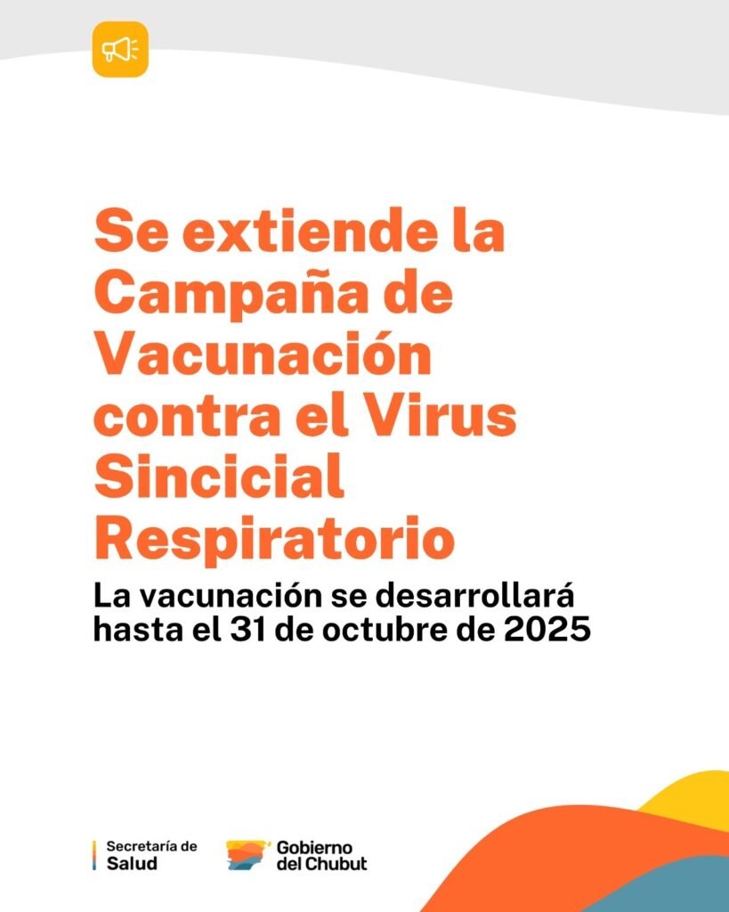 En el marco del fuerte trabajo de prevención que promueve la gestión del gobernador Ignacio «Nacho» Torres, el Gobierno del Chubut a través de la Secretaría de Salud provincial, informó que la Campaña de Vacunación contra el Virus Sincicial Respiratorio (VSR), destinada a embarazadas, se extenderá hasta el 31 de octubre próximo.