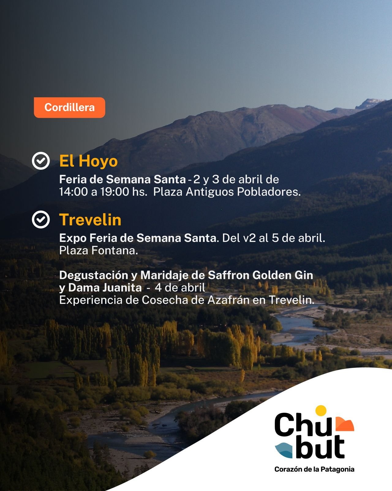 En Trevelin estará la Expo Feria de Semana Santa, prevista entre el 2 al 5 de abril en el Polideportivo Municipal; así como una jornada de degustación y maridaje de Saffron Golden Gin y Dama Juanita, el 4 de abril (Experiencia de cosecha de azafrán).