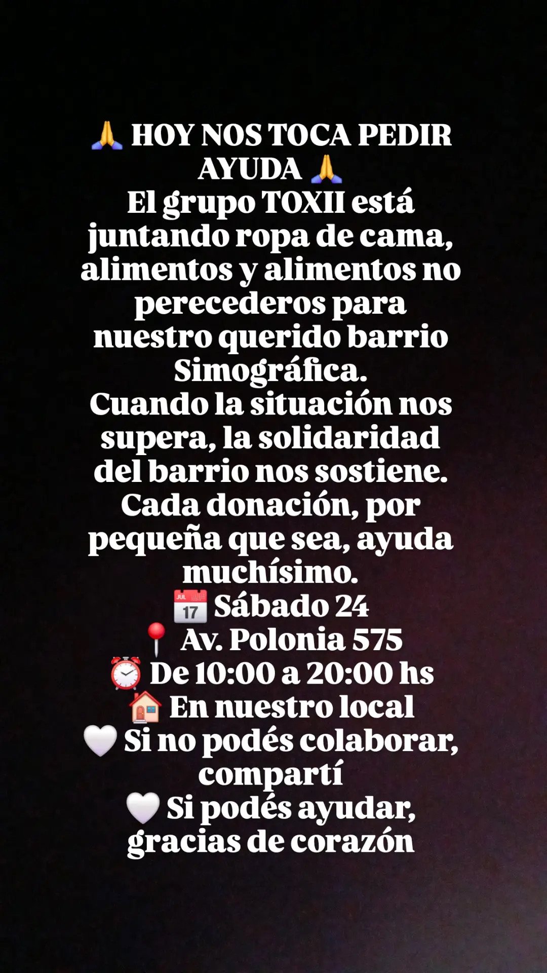 El grupo TOXII está organizando una colecta solidaria para recaudar ropa de cama, alimentos y alimentos no perecederos destinados al barrio Sismográfica, afectado por catástrofe geológica
