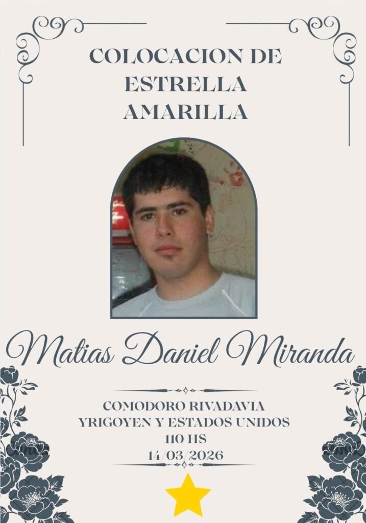 Familiares, amigos y vecinos realizarán este 14 de marzo un acto de colocación y pintura de la Estrella Amarilla en Ruta 3 y Estados Unidos, en Comodoro Rivadavia, para recordar a Matías Daniel Miranda y renovar el pedido de conciencia y responsabilidad vial.