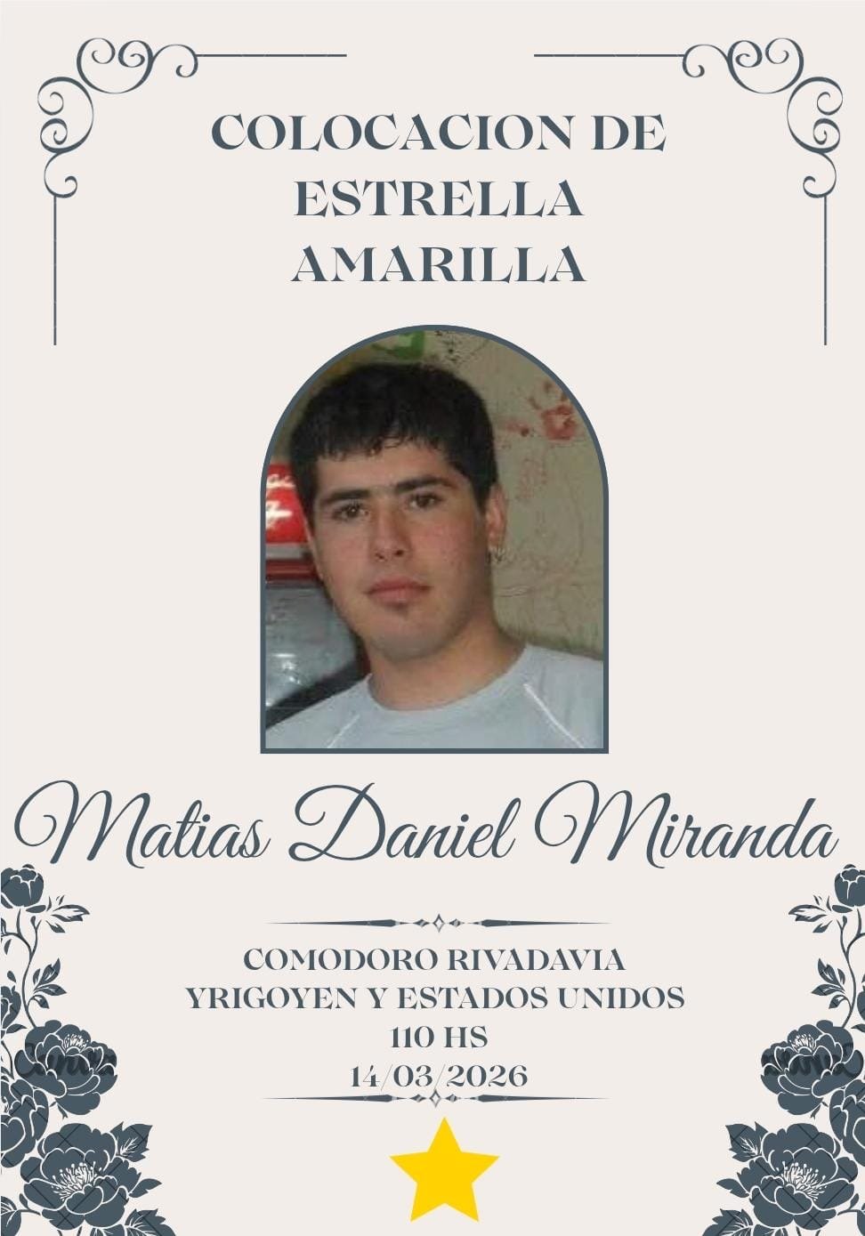 Este sábado 14 de marzo a las 10 horas se llevará adelante la colocación y pintura de una Estrella Amarilla en memoria de Matías Daniel Miranda, al cumplirse 14 años de su fallecimiento.