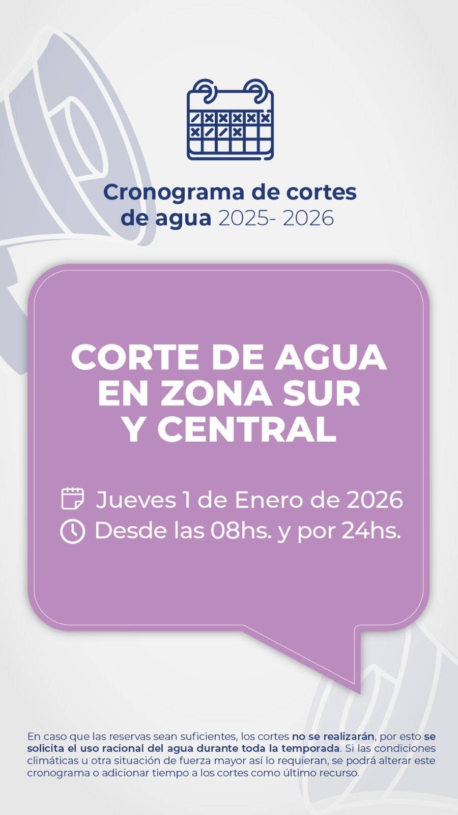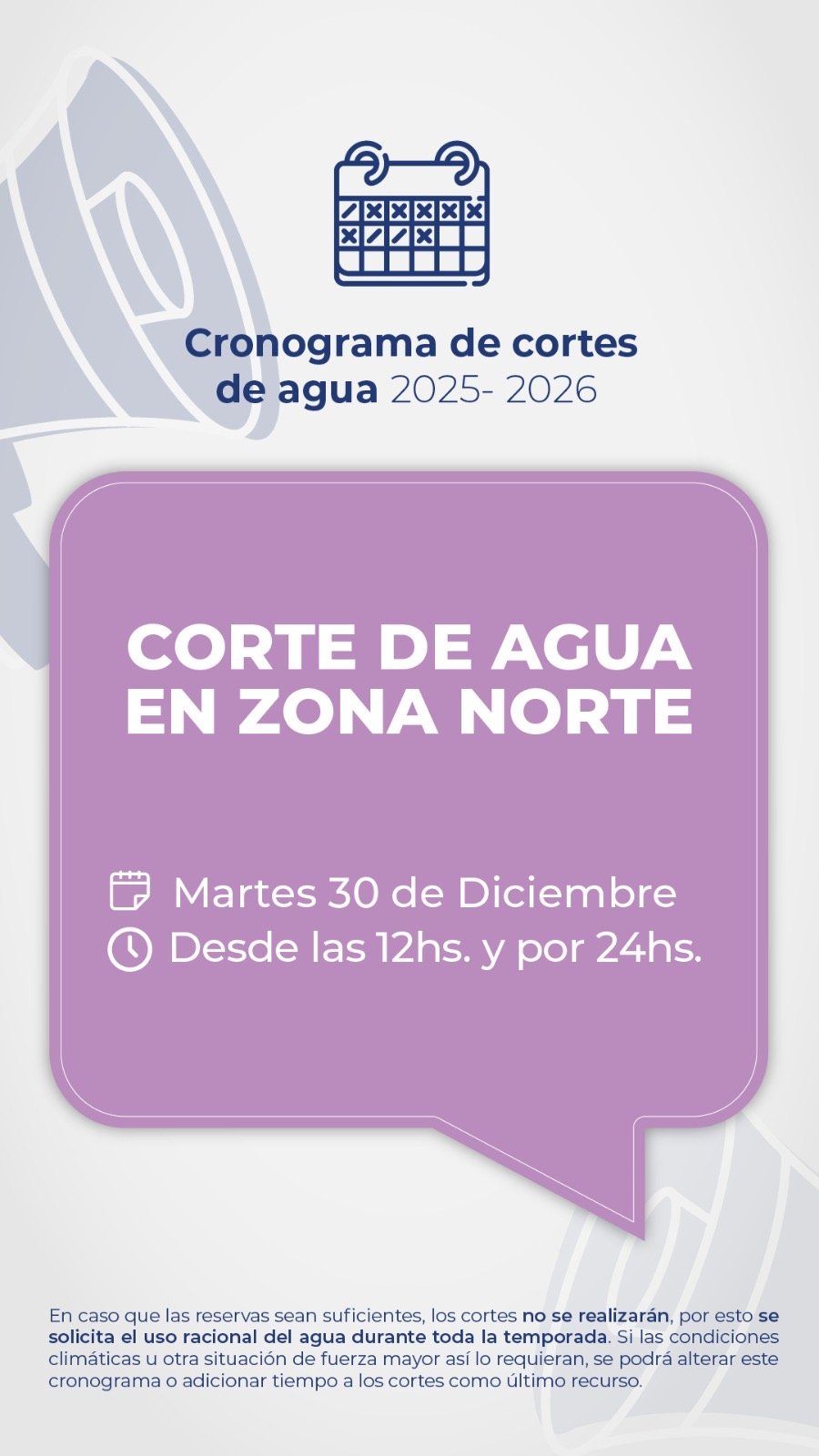En el marco de las fiestas navideñas, hoy martes 30 de diciembre, desde las 12hs. y por un lapso de 24hs., se interrumpe el suministro de agua en Zona Norte; y el jueves 01 de enero de 2026, desde las 08hs. y por 24hs, se interrumpe en Zona Sur y Central, para recuperar las reservas de Puesto La Mata.