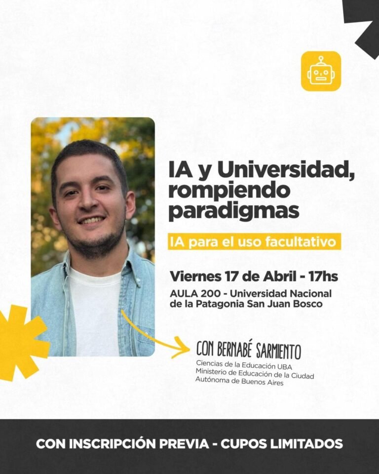 Este viernes 17 de abril a las 17 horas se llevará a cabo en Comodoro Rivadavia la charla “IA y Universidad: rompiendo paradigmas”, un espacio de reflexión y formación sobre el impacto de la inteligencia artificial en el ámbito académico.