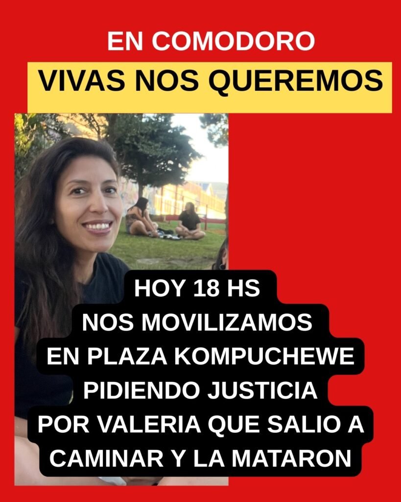 Una movilización se llevará a cabo hoy a las 18 horas en la Plaza Kompuchewe, en Comodoro Rivadavia, bajo el lema «Vivas nos queremos». La protesta busca pedir justicia por el caso de Valeria, una mujer que salió a caminar y fue asesinada.