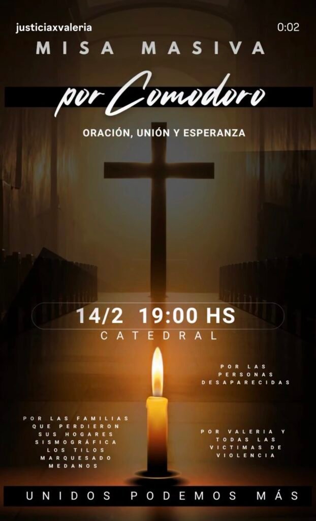 Este viernes 14 de febrero a las 19 horas se realizará una misa masiva en la Catedral de Comodoro Rivadavia, bajo el lema “Oración, unión y esperanza”, con el objetivo de acompañar a la comunidad en un contexto marcado por el dolor, la incertidumbre, la búsqueda de justicia y que es impulsado desde la cuenta de redes sociales llamada Justicia por Valeria.