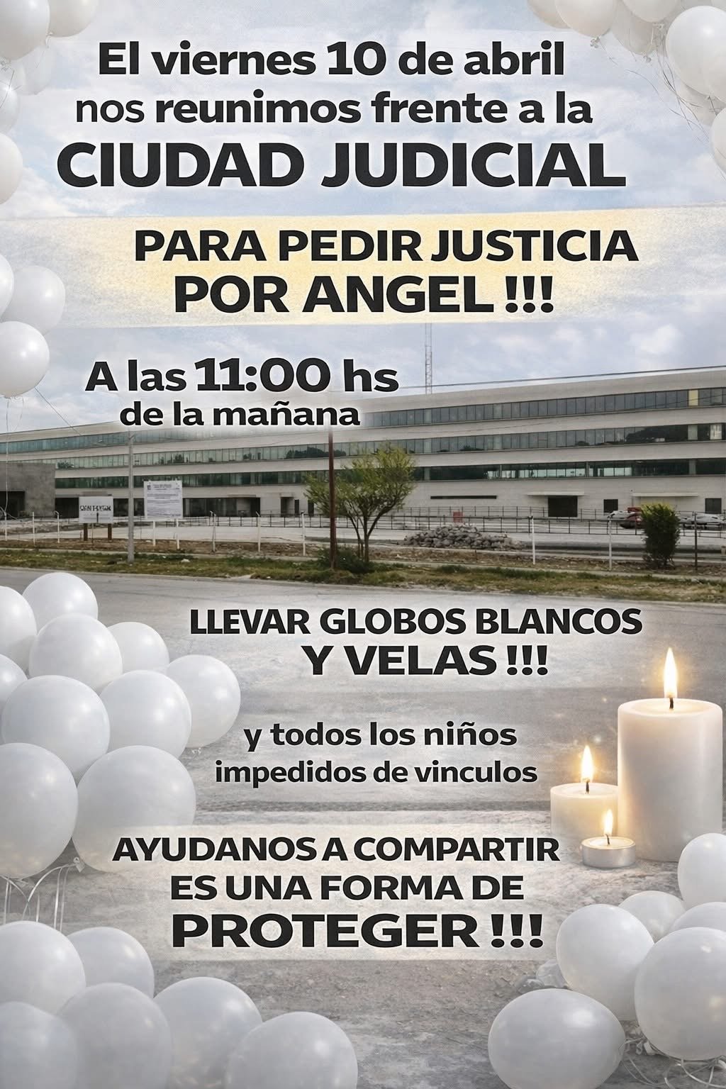 Según el mensaje difundido, los organizadores invitan a los asistentes a llevar globos blancos y velas, en un gesto simbólico que acompañe el pedido de justicia. La iniciativa no solo apunta a visibilizar el caso de Ángel, sino también a generar conciencia sobre otras situaciones que involucran a niños impedidos de mantener vínculos familiares.