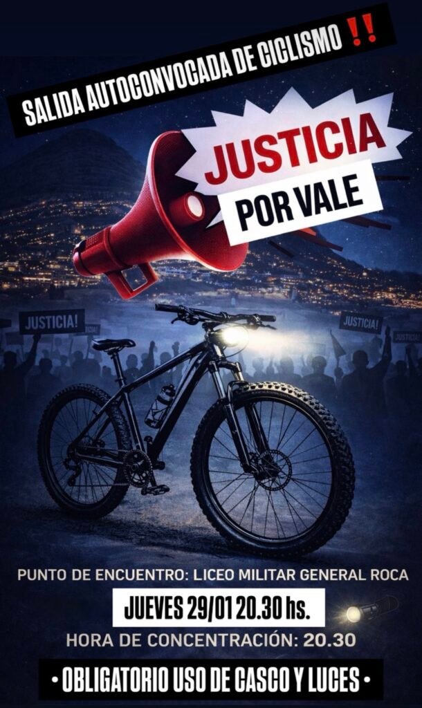 La convocatoria busca expresar un reclamo de justicia, como indica el cartel con un megáfono que dice «¡¡SALIDA AUTOCONVOCADA DE CICLISMO!! JUSTICIA POR VALE».