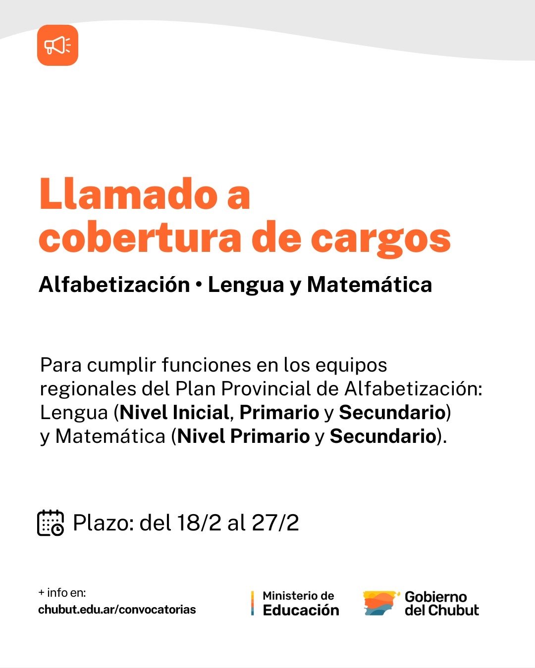 La información completa de los llamados para Referentes Regionales de Alfabetización en Lengua y en Matemática puede consultarse en la sección “Convocatorias” del sitio oficial del Ministerio de Educación (https://chubut.edu.ar/convocatorias/). En la solapa correspondiente a cada convocatoria se encontrarán más detalles, y los enlaces a los formularios de inscripción estarán disponibles a partir del 18 de febrero.
