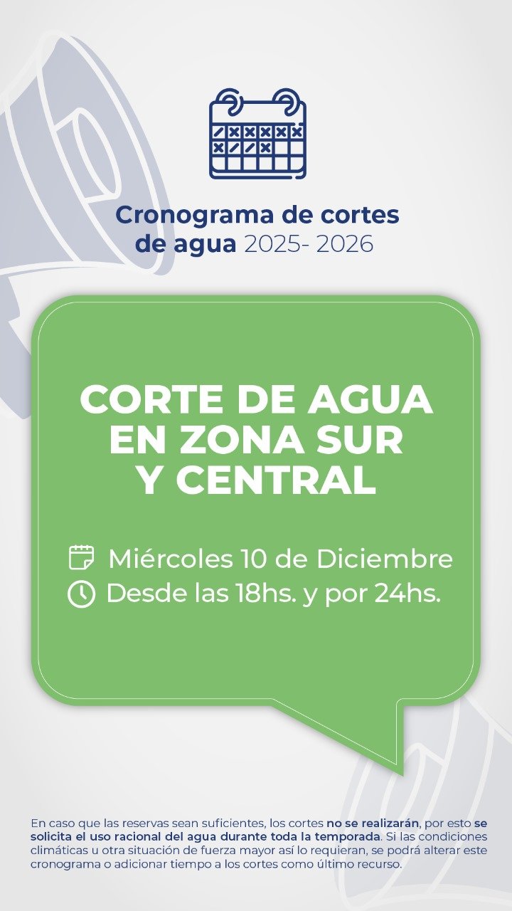 Este martes 09 de diciembre, desde las 18hs. y por un lapso de 24hs., se interrumpe el suministro de agua en Zona Norte; y mañana, miércoles 10 de diciembre, desde las 18hs. y por 24hs, se interrumpe en Zona Sur y Central, para recuperar las reservas de Puesto La Mata.