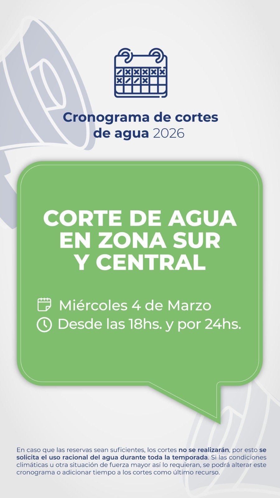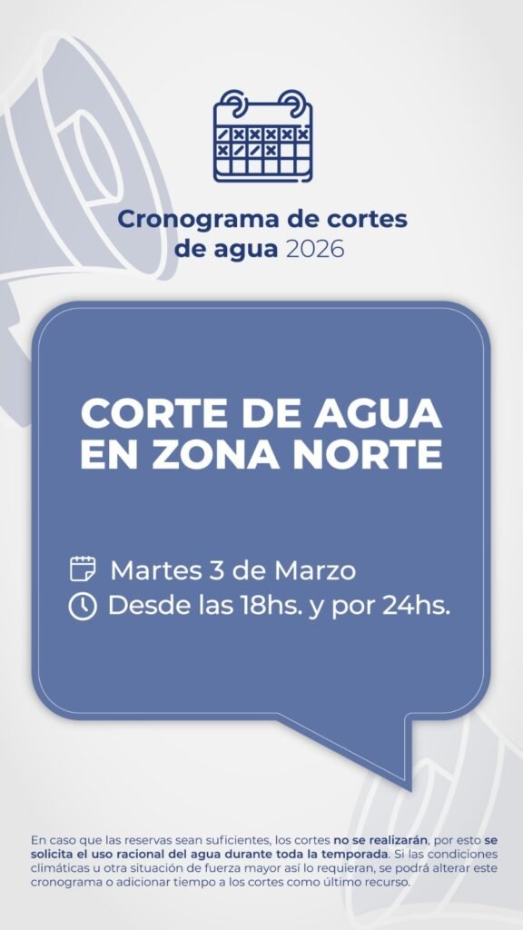 Este martes 03 de marzo, desde las 18hs. y por un lapso de 24hs., se interrumpe el suministro de agua en Zona Norte; y mañana, miércoles 04 de marzo, desde las 18hs. y por 24hs, se interrumpe en Zona Sur y Central, para recuperar las reservas de Puesto La Mata.