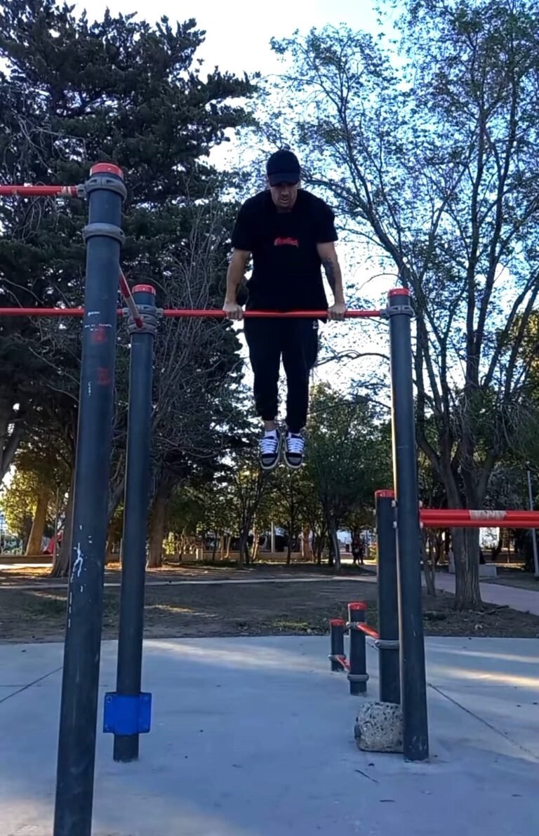 “Comencé a subir unos videos y el algoritmo de Instagram me empezó a mostrar videos de calistenia. Pero hasta ese momento no sabía que existía la palabra calistenia y comencé. Y en diciembre del 2021 en la plaza de km 8, que todavía no estaba terminada, vi cuando estaban cementando todo, yo todos días pasaba por el lugar. Y creo que debo haber sido el primero que tocó las barras. Estaba a la expectativa que saquen las maderas y todo para probarlas. Al ver que las barras eran diferentes a las que tenía en mi casa comencé a practicar”.