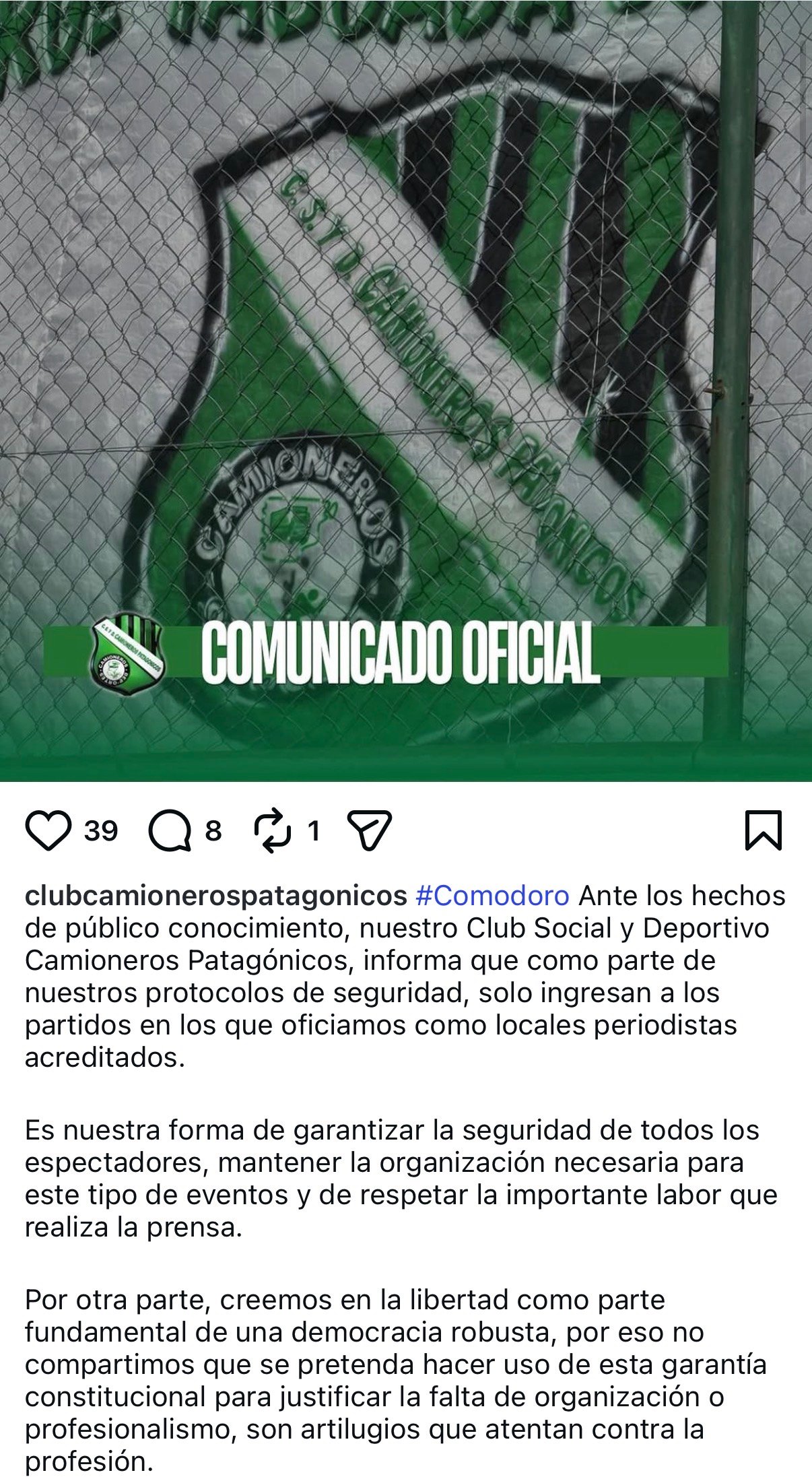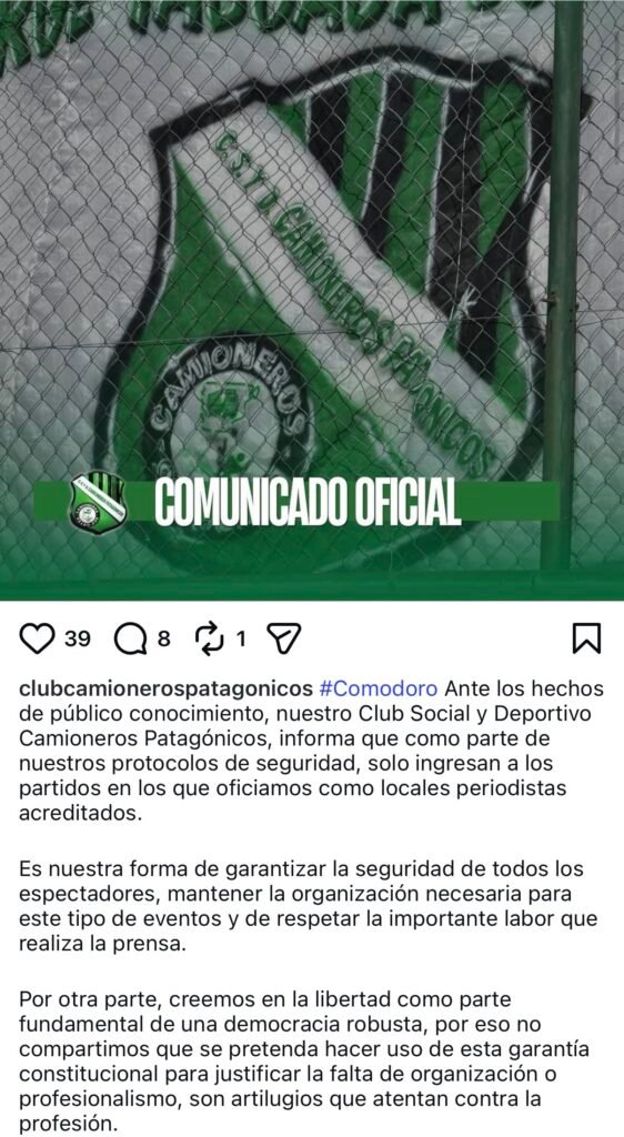Ante hechos de público conocimiento, el Club Social y Deportivo Camioneros Patagónicos comunicó que, en el marco de sus protocolos de seguridad, solo se permitirá el ingreso a los partidos en los que actúe como local a periodistas debidamente acreditados.