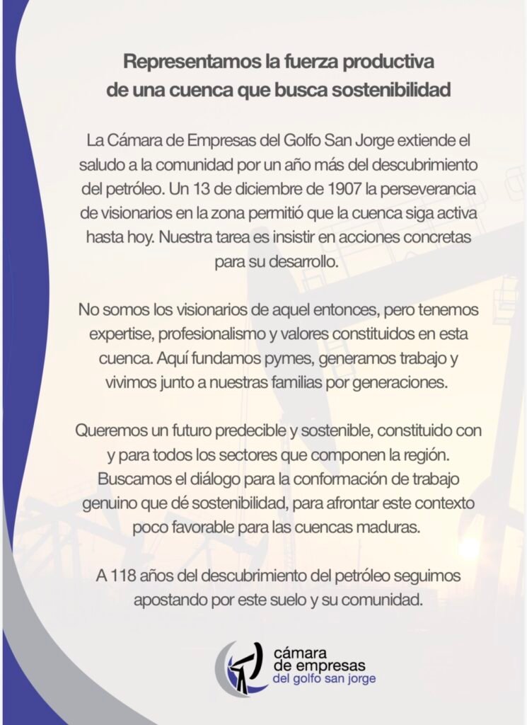 La Cámara de Empresas del Golfo San Jorge concluyó su mensaje reafirmando su compromiso con la comunidad y el suelo de la región. «A 118 años del descubrimiento del petróleo seguimos apostando por este suelo y su comunidad», finalizaron.