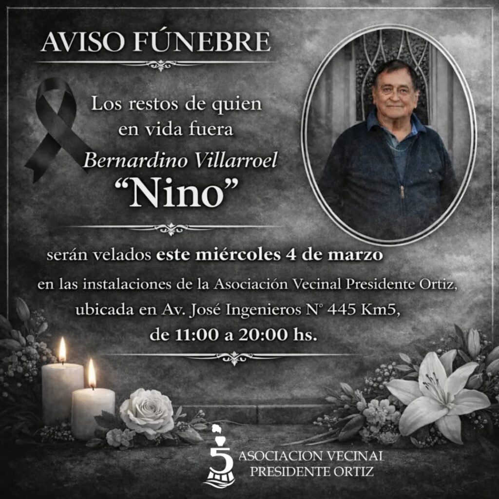 La Asociación Vecinal del barrio Presidente Ortiz expresó su profundo pesar por el fallecimiento de Bernardino “Nino” Villarroel, un vecino muy querido y reconocido en la comunidad.