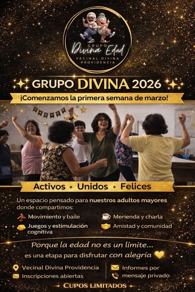 El Grupo Divina Edad – Adultos Mayores informa a la comunidad que dará inicio a sus actividades el próximo martes 3 de marzo, en la sede de la Vecinal Divina Providencia, con encuentros semanales todos los martes de 14 a 17 horas.