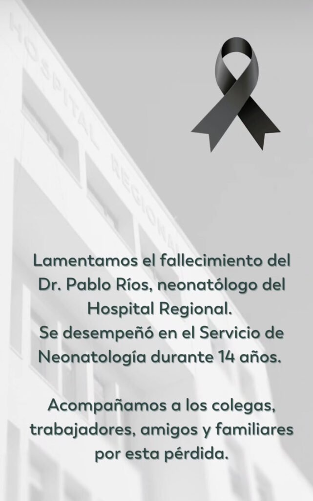 La noticia se conoció en la noche del domingo y consternó a toda la comunidad que reconocía la labor del Neonatólogo del Hospital Regional.