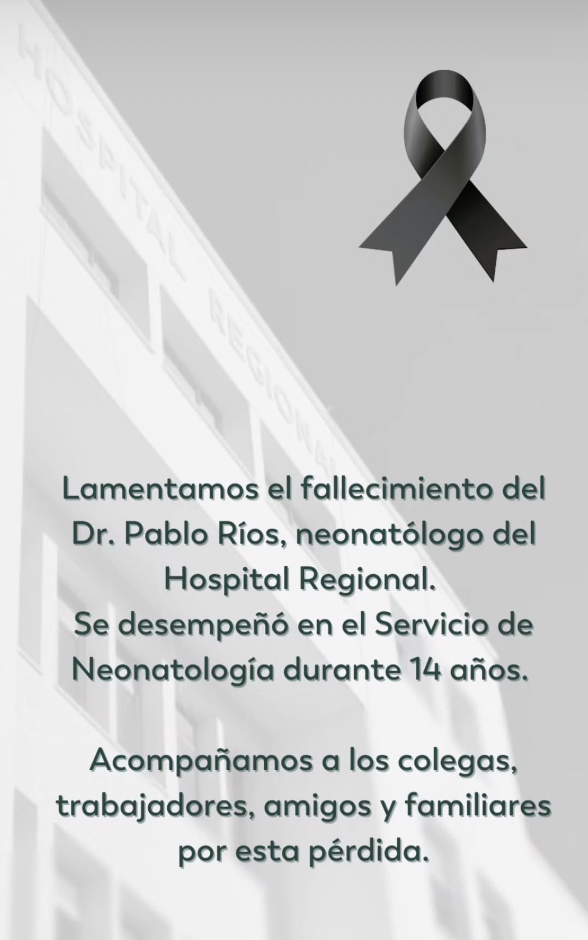 A través de un comunicado oficial, sus compañeros de trabajo lo recordaron como un profesional «muy querido» que «siempre estuvo comprometido con el Servicio de Neonatología y con todo el Hospital Regional».