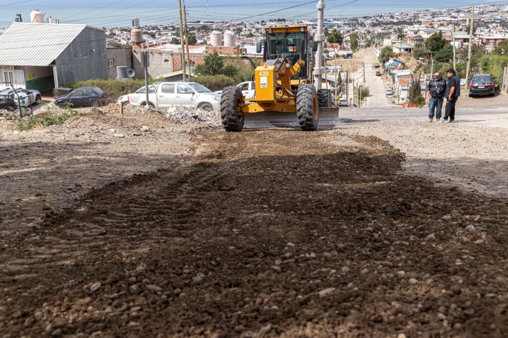 Las tareas incluyeron repaso con motoniveladora en las calles Los Pinos, Carabelas, Pasaje Fragata Sarmiento y Patagonia. Además, se realizó el riego con camión regador para consolidar el suelo y garantizar mayor durabilidad a los trabajos efectuados.