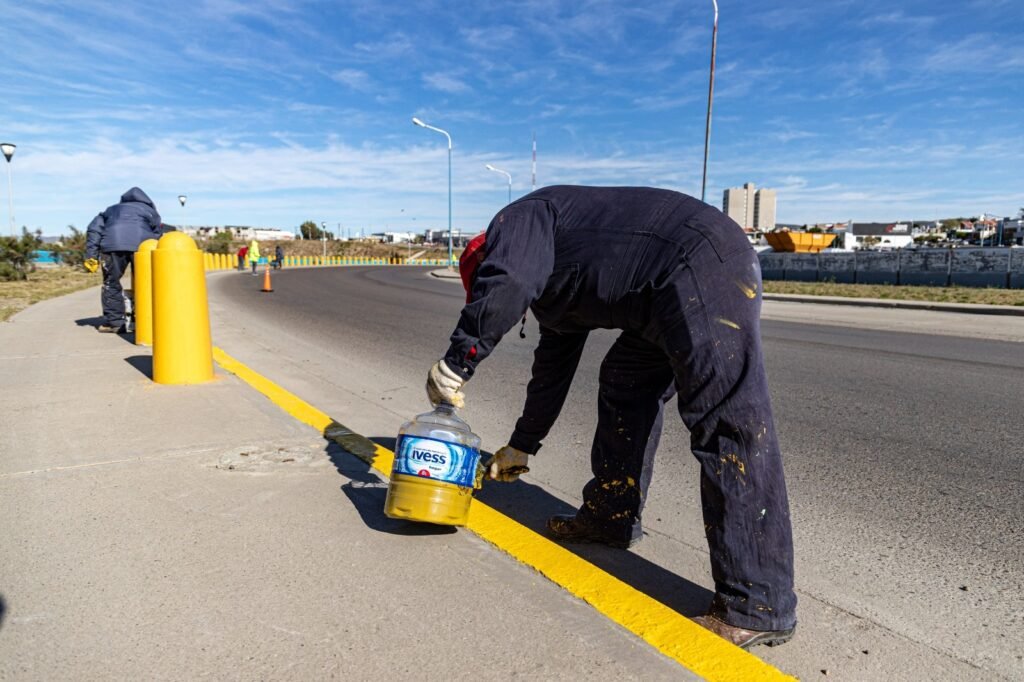 Las cuadrillas municipales avanzaron con los trabajos de refacción y pintado de bancos, farolas, muros y cordones de la vereda peatonal para una mayor señalización vial. Por otro lado, comenzaron las tareas de saneamiento del canal pluvial de la zona de los kilómetros.