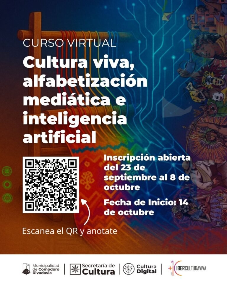 La Secretaría de Cultura de la Municipalidad de Comodoro Rivadavia, a través del Programa de Cultura Digital y Alfabetización Mediática, junto con IberCultura Viva, abrió la inscripción –hasta el 8 de octubre- para el curso virtual y gratuito “Cultura viva, alfabetización mediática e inteligencia artificial”, una capacitación de seis semanas que busca fortalecer la formación en derechos culturales y el uso crítico de las tecnologías digitales.
