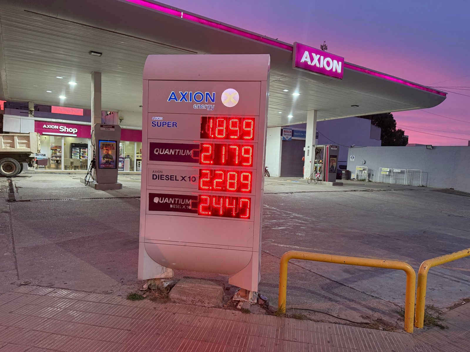 Según se observa en la imagen, en estaciones de Axion Energy los valores alcanzaron aproximadamente los $1899 para la nafta súper, $2179 en la línea premium (Quantum) y más de $2289 en el diésel, con versiones premium que superan los $2440 por litro.