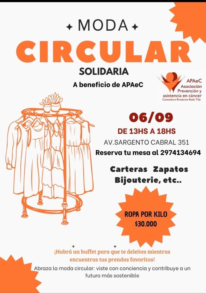 La Asociación Prevención y Asistencia en Cáncer (APAEC) de Comodoro Rivadavia y Rada Tilly organiza una feria de moda circular este sábado 6 de septiembre, de 13 a 18 horas, en Sargento Cabral 351.