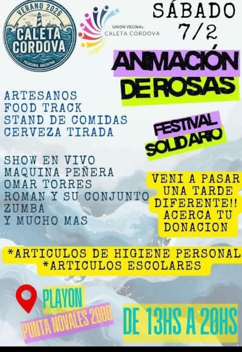 La comunidad de Caleta Córdova se prepara para vivir una nueva jornada de encuentro, música y solidaridad. Este sábado 7 de febrero, desde las 13 hasta las 20 horas, se realizará una feria solidaria en el Playón de Punta Novales 2000, con el objetivo de reunir donaciones para la Sismográfica de la localidad.