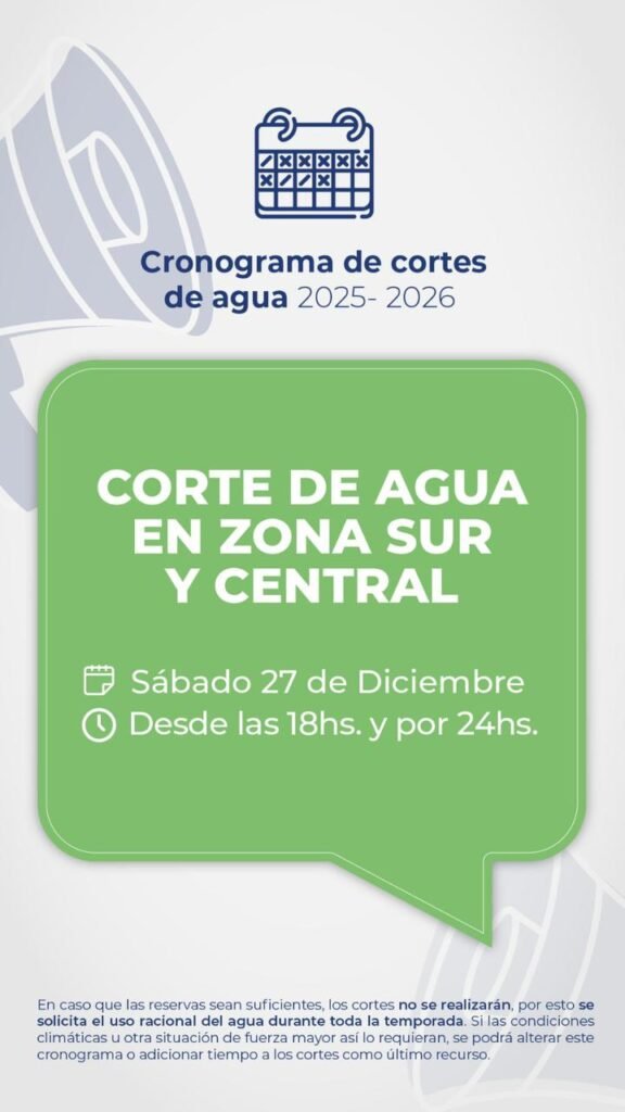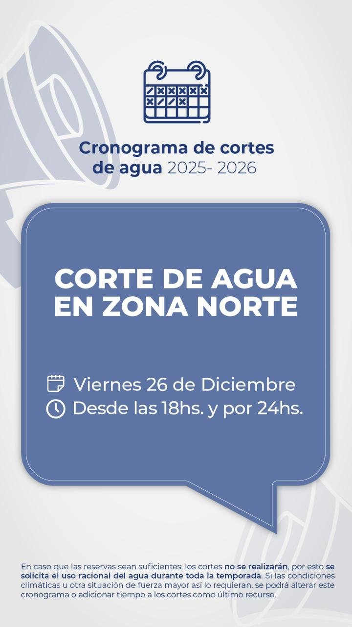 Este viernes 26 de diciembre, desde las 18hs. y por un lapso de 24hs., se interrumpe el suministro de agua en Zona Norte; y mañana, sábado 27 de diciembre, desde las 18hs. y por 24hs, se interrumpe en Zona Sur y Central, para recuperar las reservas de Puesto La Mata.