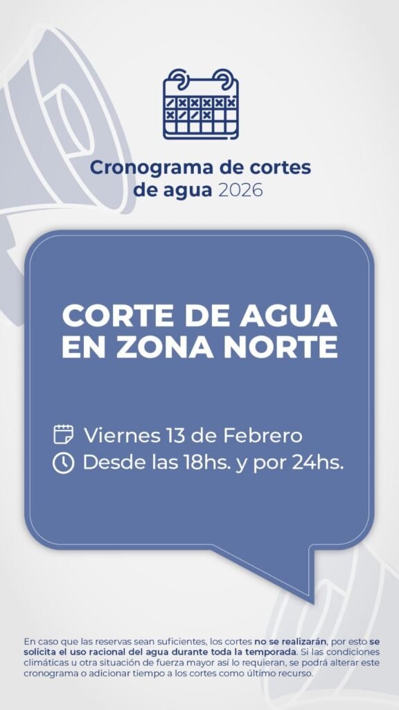 Este viernes 13 de febrero, desde las 18hs. y por un lapso de 24hs., se interrumpe el suministro de agua en Zona Norte; y mañana, sábado 14 de febrero, desde las 18hs. y por 24hs, se interrumpe en Zona Sur y Central, para recuperar las reservas de Puesto La Mata