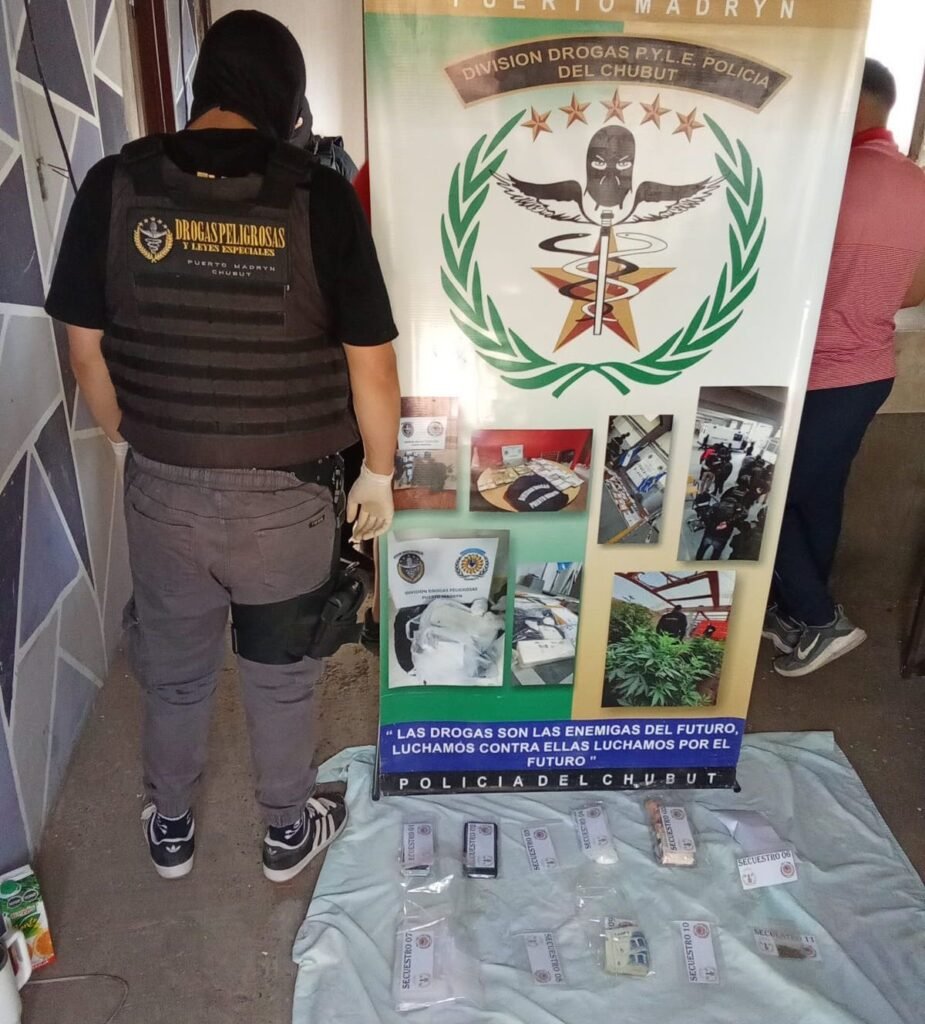 Como resultado del operativo, fueron detenidas seis personas mayores de edad —dos hombres y cuatro mujeres— identificadas como los principales distribuidores de estupefacientes en Puerto Madryn. Además, se incautaron siete ladrillos compactos de marihuana con un peso total de 6,5 kilos, un ladrillo de cocaína de un kilo y sustancias fraccionadas listas para su comercialización. También se secuestraron teléfonos celulares, balanzas de precisión, un millón de pesos en efectivo y cuatro vehículos que eran utilizados para el transporte y la distribución de la droga, junto a otros elementos de interés para la causa.