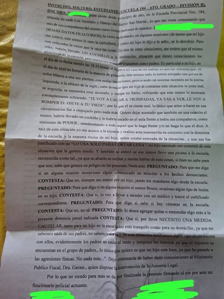 «Empezó con cosas obscenas y tratos violentos. Pero el cuadro se agravó con el correr de las semanas. Un menor llevó un cuchillo al colegio y luego ingresó con una picana eléctrica». Finalmente, aparecieron balas, que incluso fueron entregadas a una nena, hecho que se viralizó en el grupo de madres y padres.