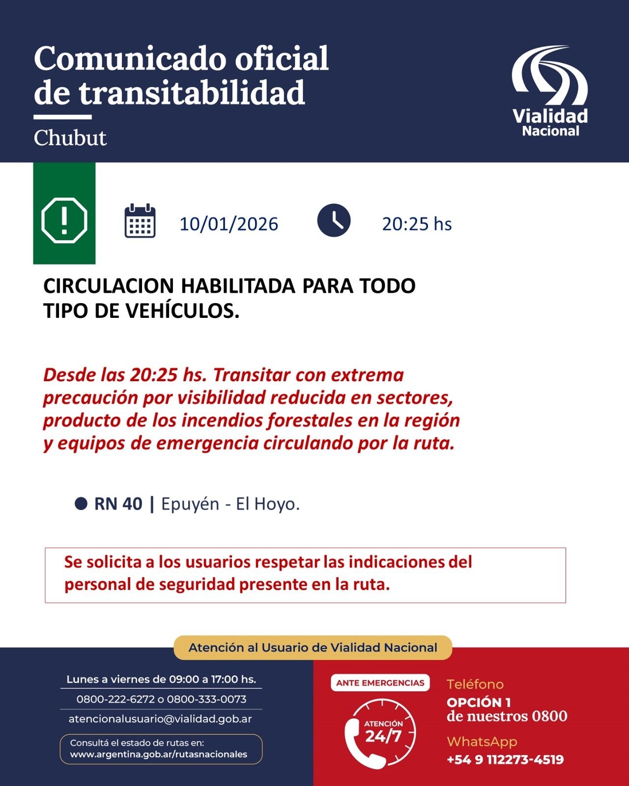 Vialidad Nacional informó que, a partir de las 20:25 hs. del 10 de enero de 2026, la ruta estará abierta para todo tipo de vehículos, pero se debe transitar con extrema precaución debido a la visibilidad reducida por humo de incendios forestales.