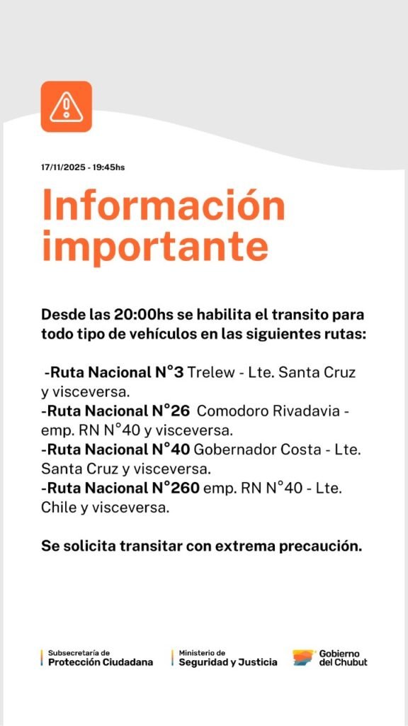 Se solicita transitar con extrema precaución. El aviso es emitido por la Subsecretaría de Protección Ciudadana y el Ministerio de Seguridad y Justicia del Gobierno del Chubut.