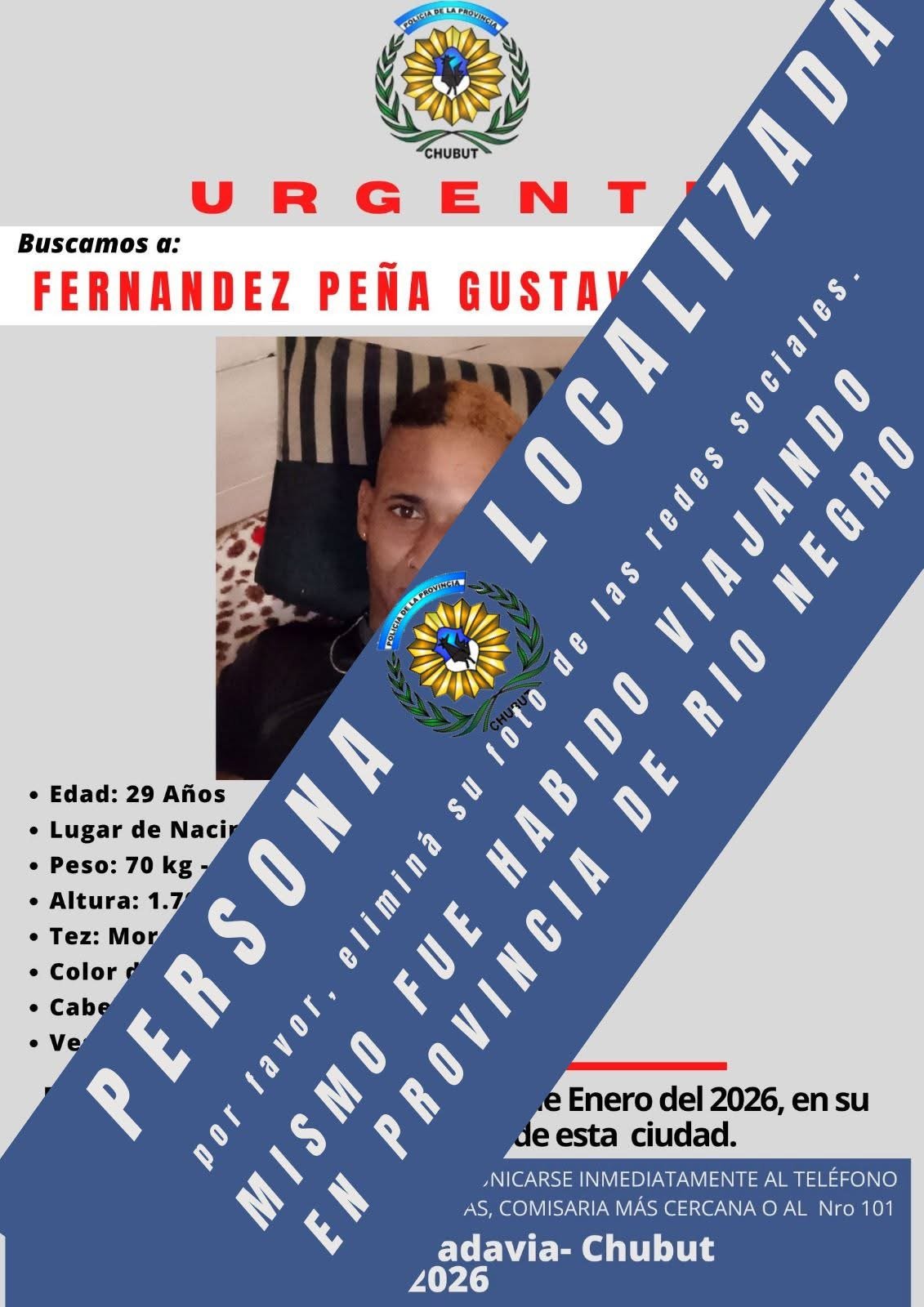 En la noche del jueves la División Búsqueda de Personas había activado la búsqueda de un hombre de nacionalidad dominicana del cual no había novedades desde la madrugada. Finalmente fue hallado en Río Negro y explicó que se había ido de Comodoro buscando nuevos rumbos en Buenos Aires.