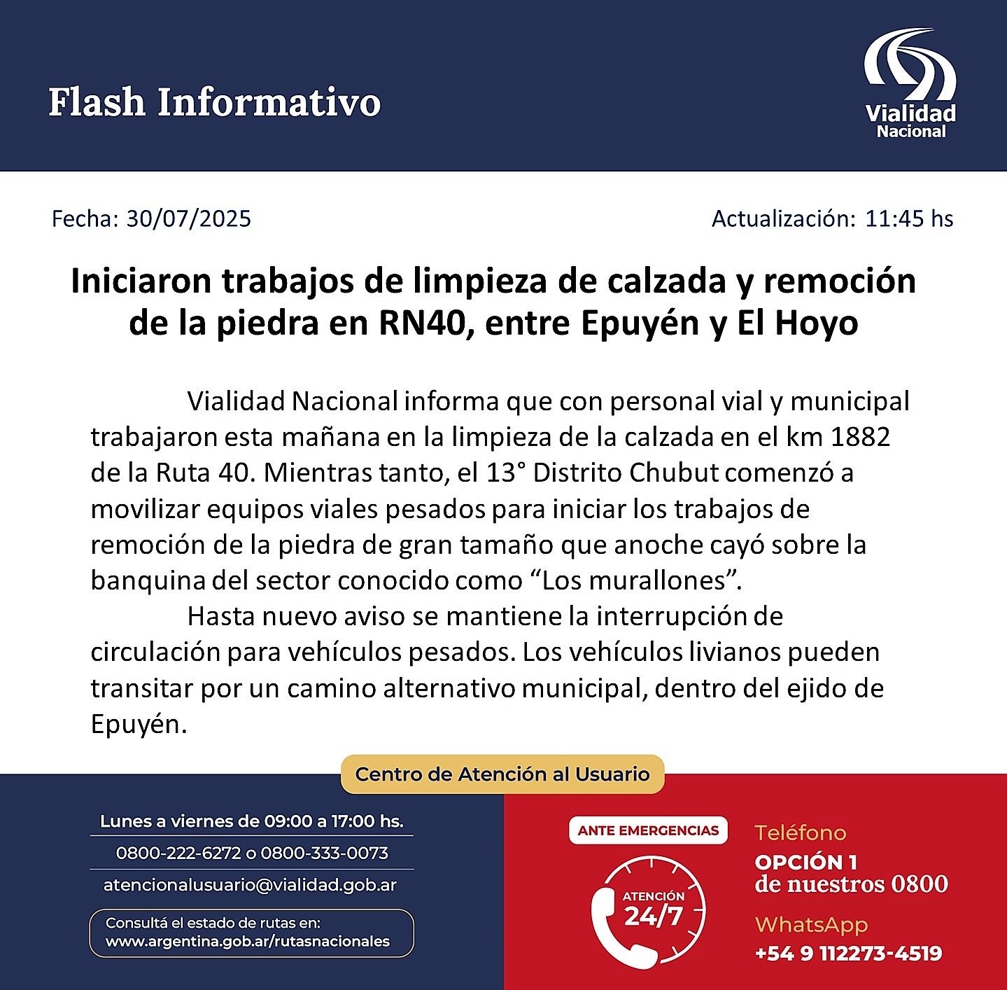 Vialidad Nacional informa que con personal vial y municipal trabajaron esta mañana en la limpieza de la calzada en el km 1882 de la Ruta 40.
