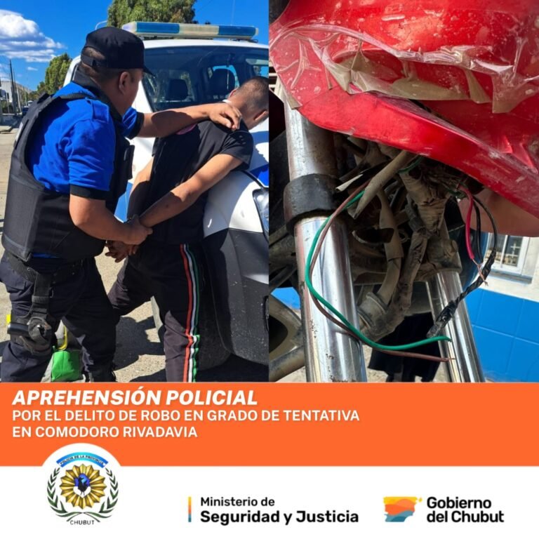 Un hombre de 23 años fue detenido este miércoles por la tarde en Comodoro Rivadavia, acusado de intentar robar una motocicleta en la vía pública. El hecho ocurrió alrededor de las 16 horas en la intersección de las calles Hipólito Yrigoyen y Polonia.