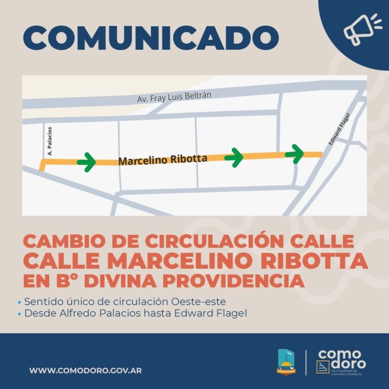 La Municipalidad de Comodoro Rivadavia, a través de la Dirección General de Educación Vial de la Secretaría de Control Urbano y Operativo, informa a la comunidad que, a partir del viernes 12 de abril, se modificará el sentido de circulación de calle Padre Marcelino Ribotta, entre Alfredo Palacios y Edward Flagel de barrio Divina Providencia; en sentido oeste-este, de acuerdo a lo establecido en la Resolución N° 16466/23.