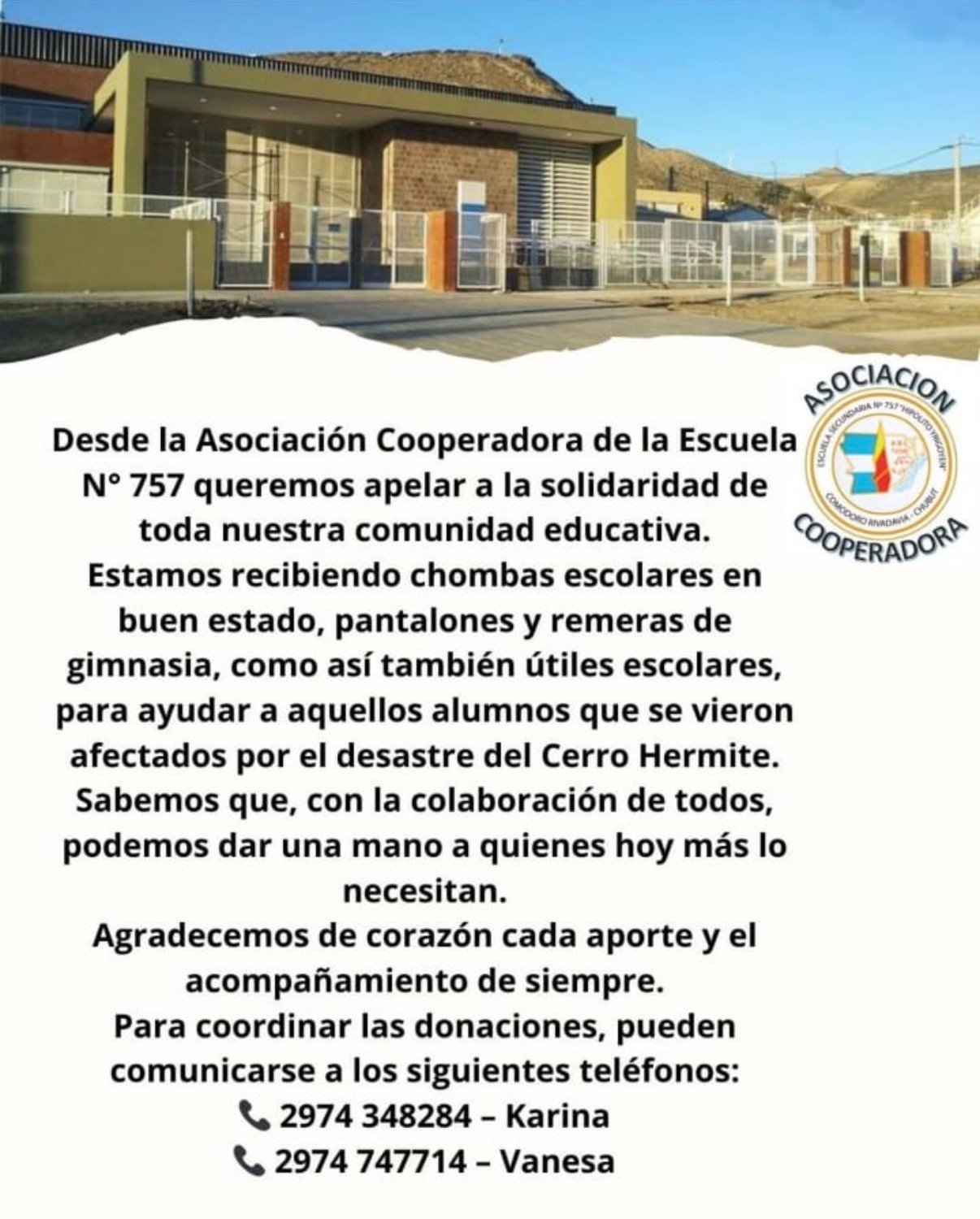 La Asociación Cooperadora lanzó una campaña solidaria destinada a acompañar a estudiantes que se vieron afectados por el desastre del Cerro Hermite.