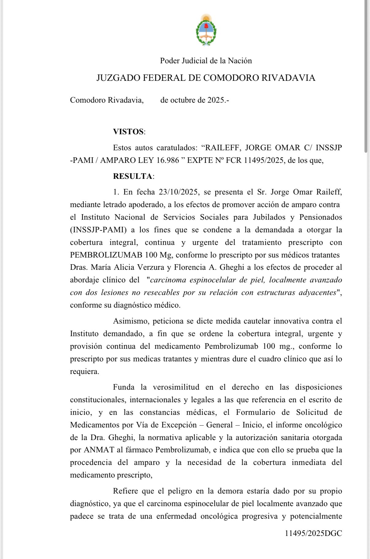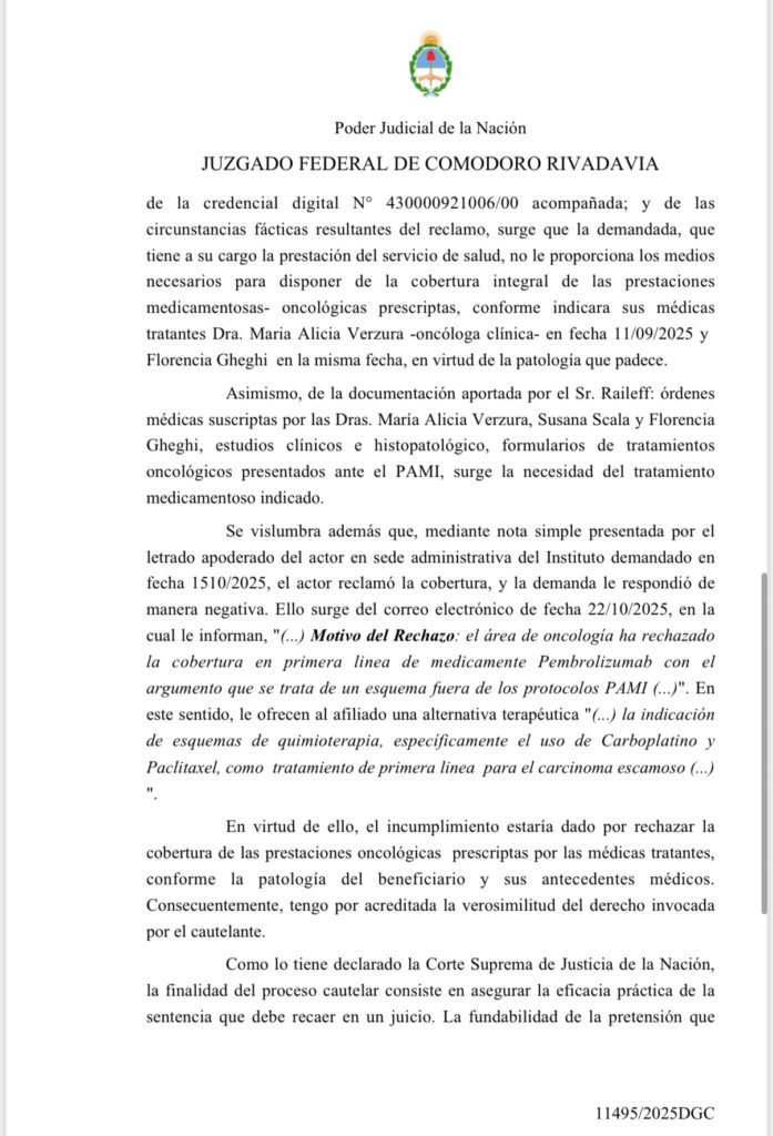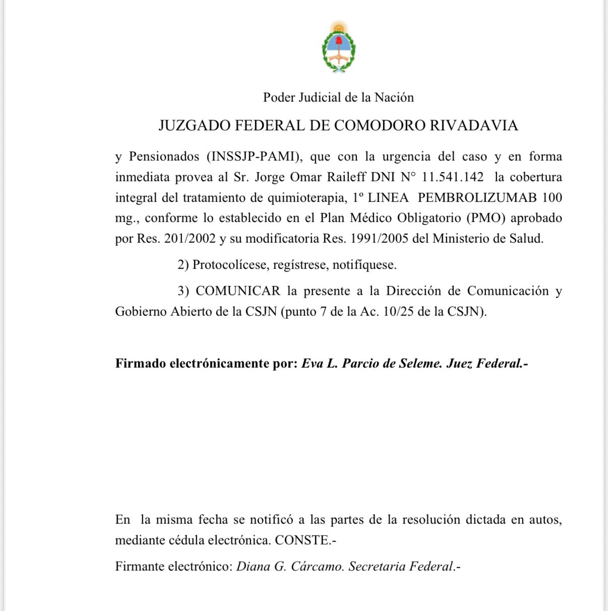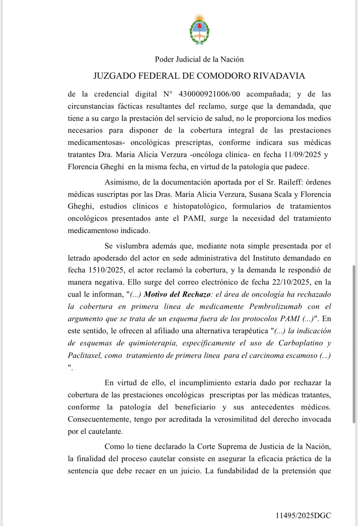 En un fallo relevante, el Juzgado Federal de Comodoro Rivadavia ordenó a PAMI cubrir el tratamiento oncológico del Sr. Jorge Omar Raileff, un veterano de guerra de la ciudad, que había sido denegado por el organismo pese a haber sido prescripto por la médica especialista tratante como única opción terapéutica eficaz para su cuadro clínico.