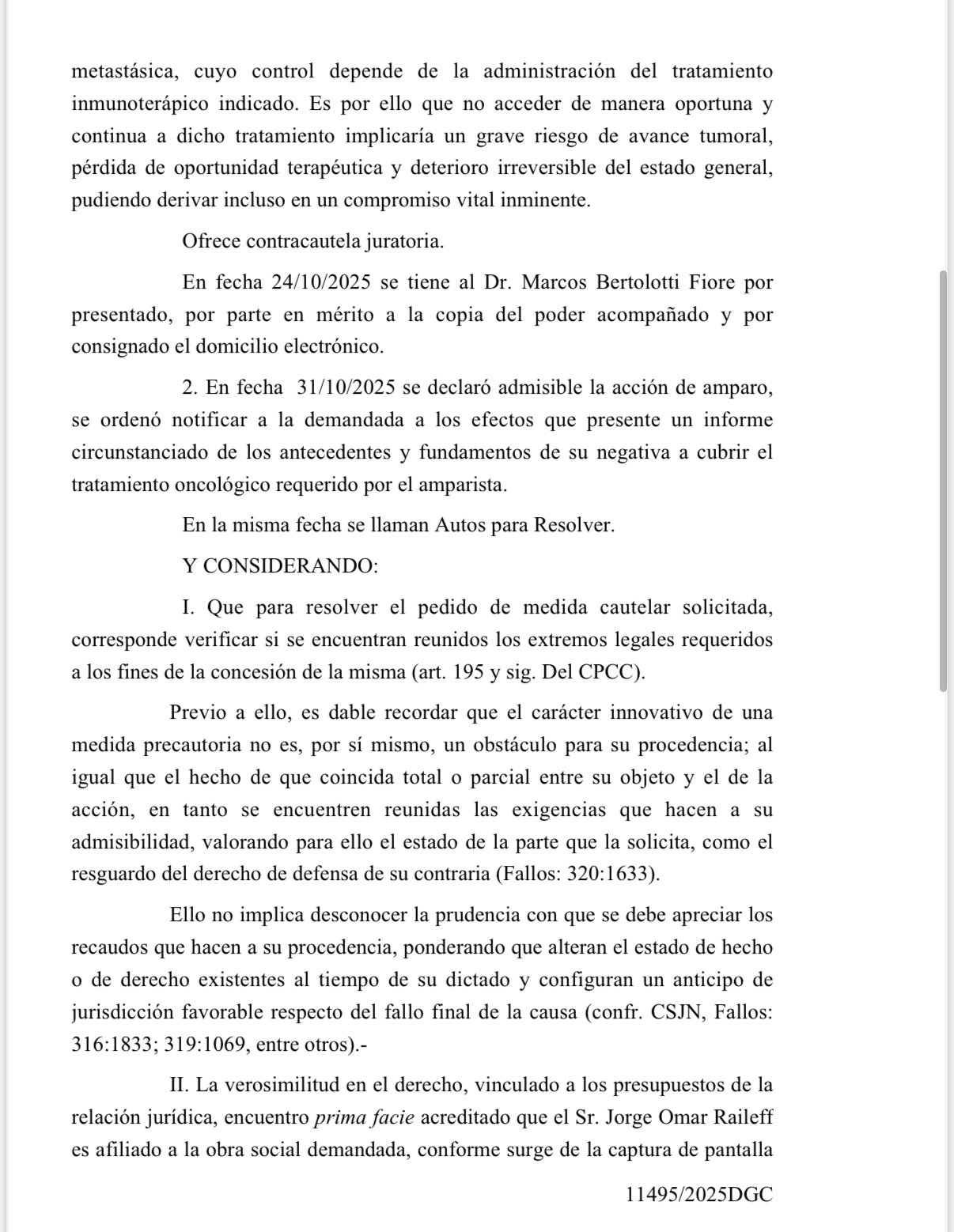La decisión judicial destaca que el incumplimiento de PAMI en cubrir el tratamiento oncológico prescripto por las médicas tratantes constituye un riesgo para la salud del Sr. Raileff, y que el tiempo que insuma el trámite principal resultaría vital para el caso.
